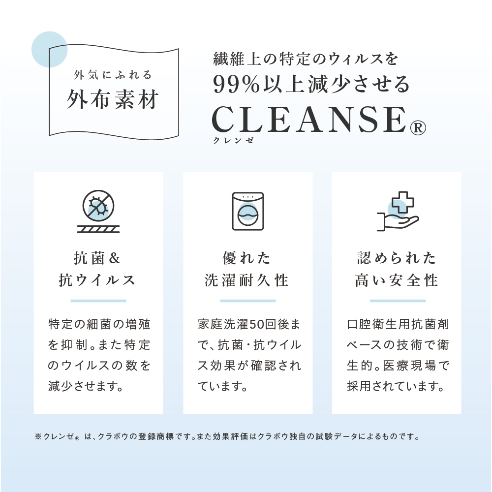- クラボウの機能繊維加工技術クレンゼ使用。特定のウイルスの数を99%減らす抗ウイルス効果があるといわれています。